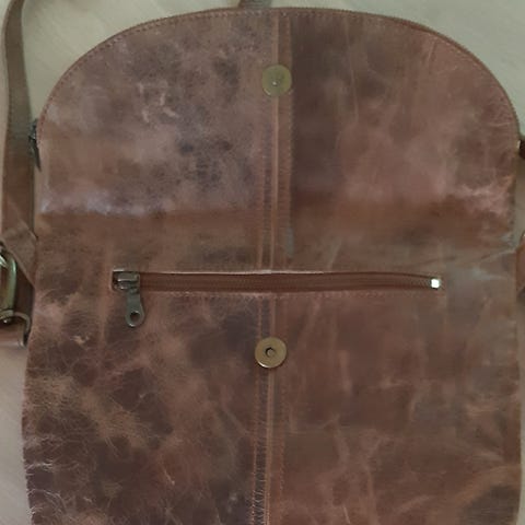 Jeg selger en sort skulderveske i skinn. Målene er ca 25x28 cm. En ekstra lomme innvendig med glidelås.