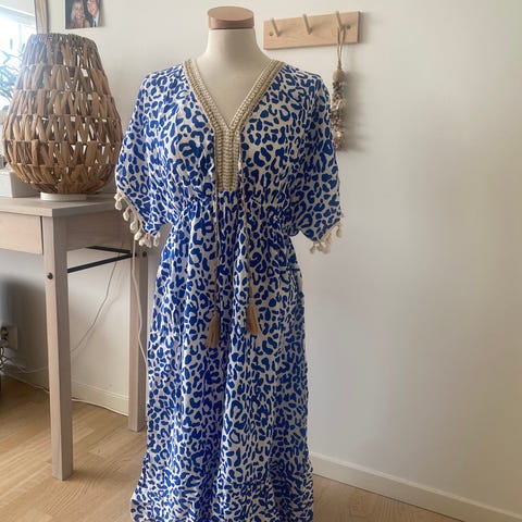 Selger nesten ikke brukt kjole, da den var litt liten for meg. Lett sommerkjole å ha med på ferie eller bruke den som lang jakkebluse til bukse. Kan sendes.