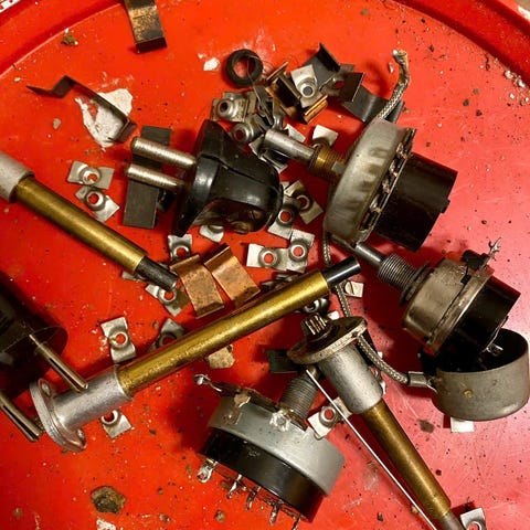 Selger deler til fornuftig pris. Knapper og ratt, indikator, potmetere, nettbryter, komplett skala opplegg, høyttalerbryter, m.m. Alt som kan demonteres. Har og deler til spolebåndopptakere 3000 serien.