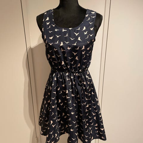 Til salgs er en mørkeblå sommerkjole med polkadotts fra GIORGIO AJUTANTI i størrelse M. Den er laget av et bomullsstoff og har et underskjørte av hvit tull. Målene er: