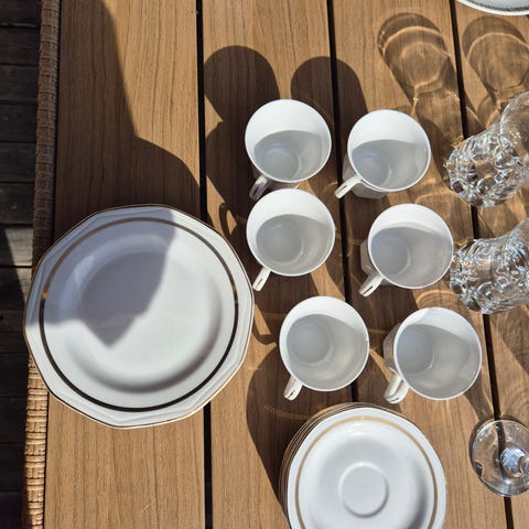 Selger dette nydelige kaffe settet med 4 espresso kopper og 4 espresso-tallerkender, og 4 større matchende tallerkener. Passer perfekt til frokost/lunsj og hverdag. Unikt sett som ikke er mulig å få tak i lenger 🧡 selges rimelig og en gull matchende vase følger med settet :)