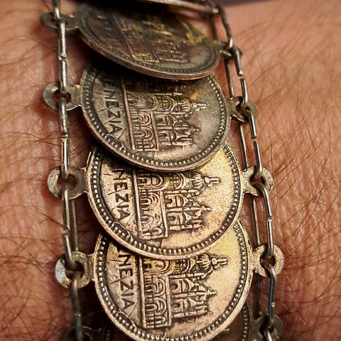 Fin gammel armbånd med Venezia motiver på en siden og Venezia symboler på andre siden.