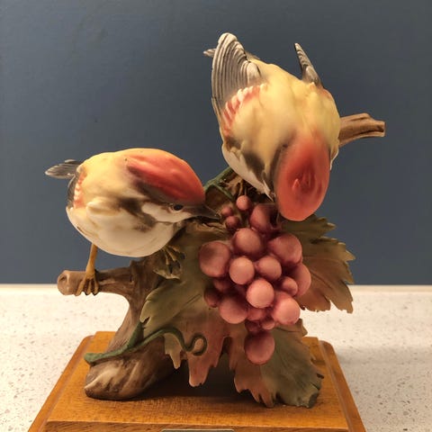 Capodimonte fuglefigur laget av porselen. Figuren viser en detaljert fugl på en blomsterdekorert base. Den er håndmalt med naturlige farger og står på en solid, mørk base. Perfekt som dekorasjon i hjemmet.