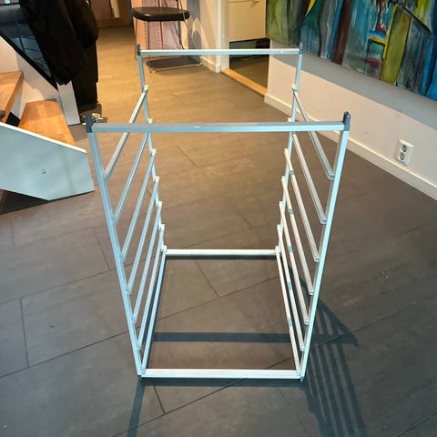 Et stativ med 7x2 skinner 54x45x150cm (består av 4 gavler 74x54cm og 6 tverrstag 45cm). Dette må settes sammen selv. Selges for kun 700,-