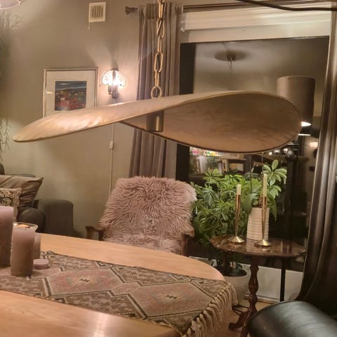 Selger en nydelig taklampe i messing fra Kentucky Oil Lamps.