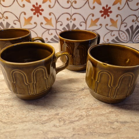 8 flotte tekopper/skåler i motiv Atna fra Stavanger flint. Produsert 73-74. Diameter 9 cm. Selges 40,- pr sett