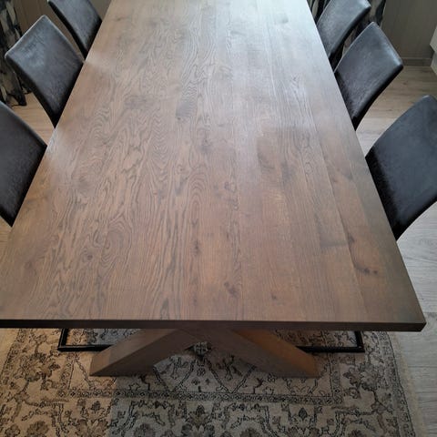 Bordplaten har noen flekker og det anbefales å slipe ned og olje på nytt.