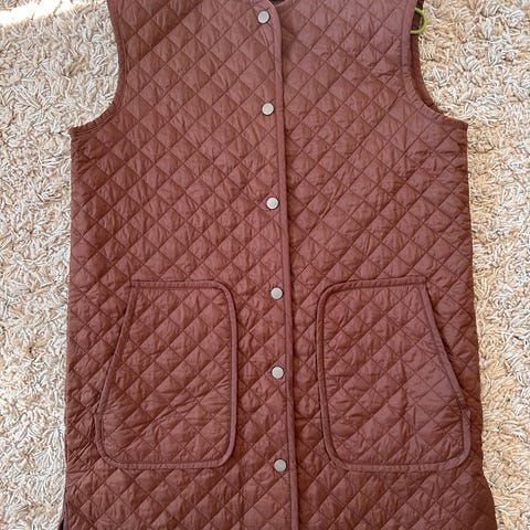 Lang vattert vest i dus grønn (vannavvisende). Avtagbar hette. Str. M. 100% polyamid. Romslig i størrelsen. Aldri brukt. Pris i butikk 799,-. Selges kr. 400,-. Kan sende med Postnord til 69,-. Se også mine andre annonser ved å klikke på navnet mitt. Mye fint både gammelt og nytt til bra priser.