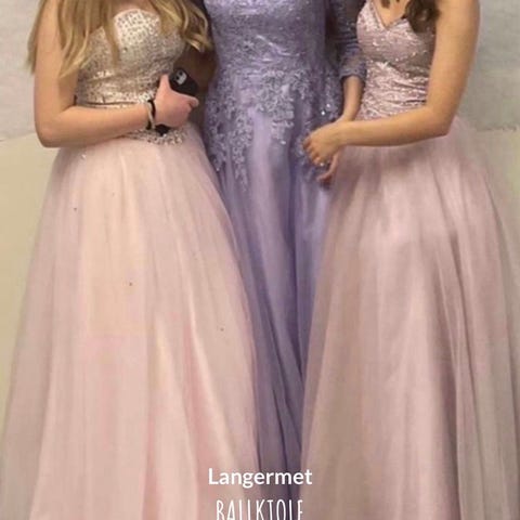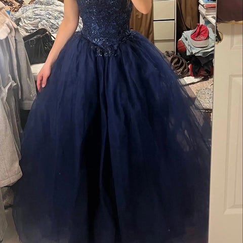 Mørkeblå ballkjole. Er størrelse M, men passer fra S til L pga. snøring i ryggen. Stroppene på skulderen kan også justeres hos skredderen. Jeg er 164 cm høy og bruker small.