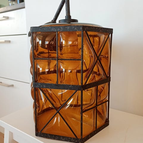 Flott retrolykt, lyslykt i auberginefarge med metallbeslag og håndtak. Høyde: 31 cm.