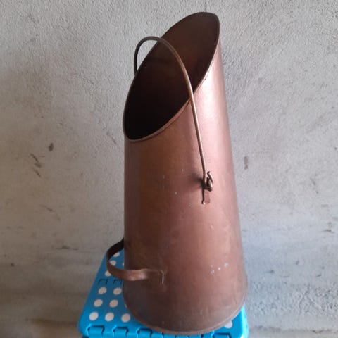 Blå Cathrineholm kjele med hvit lotus. H: 8,7 cm /13 cm med lokk, D: 27 cm / 34 med stålhanker. Kjelen er i fin stand, har små loppebitt på den sorte kanten øverst, frisk blå og hvit emalje. Kr. 1500,-