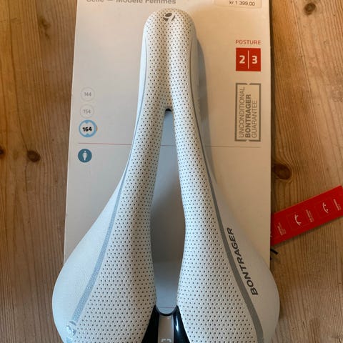 Bontrager Inform 146mm. Carbon/composite base. Hollow stainless steel rails. Komfortabelt racingsete. Har du en eldre Trek-sykkel med sliten sadel er det bare å bytte til dette originalsetet! Selges fra privat overtatt restlager etter vår avvikling av sykkelfirma (pga pensjonering)