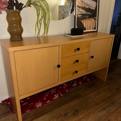 B 74 - D 35 - H 47 cm. Velholdt møbel uten skader. Kraftige skuffer med huntonittbunner.