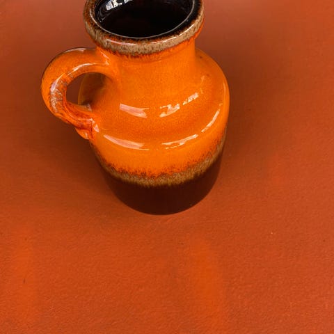 Nydelig vase til å henge på veggen. Flott glasur med gullforgylning. Produsert av Arnold Wiigs Fabrikker i Halden. (1948-1973). Uten feil eller mangler. Høyde 14,5 cm / dybde fra vegg 6 cm.