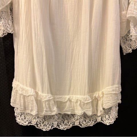 Selger en lang hvit sommer kjole. Denne er lagd i Italia og det står ingen størrelse i den. Det er meningen at den skal være litt stor, så vil tro den er en M/L.