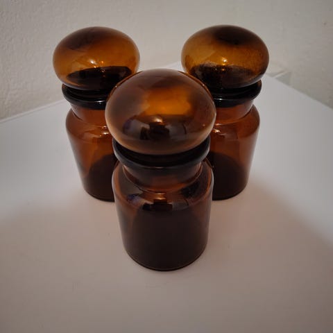 To like, feilfrie, brune glasskrukker. Antageligvis fra 1980-tallet. Med lokk er de 15,5 cm høye. Diameter i bunnen er 7 cm.