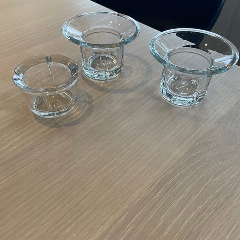 Dette er veldig nye og skinnende lysestaker i glass. ser veldig attraktiv ut. Disse er fra Rosendahl. Jeg kan sende flere bilder hvis du vil. åpen for flere spørsmål. Tåler oppvaskmaskin 50-55 grader.