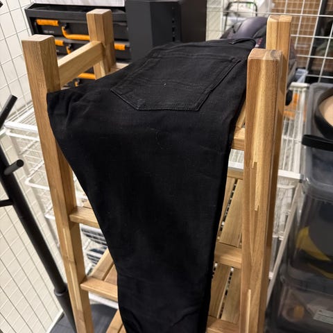 dongeribukse for mc kjøring. har knebeskyttere og tåler mer enn vanlige bukser.