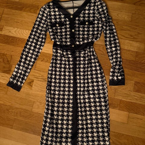 Hverdagskjole i størrelse M, svart farge og laget av elastan. Kjolen har et mønster i stoffet og en glidelås foran. Designet for kvinner.