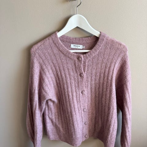 Lang cardigan fra MSCH med rib på armer og lommer. Strl M/L.