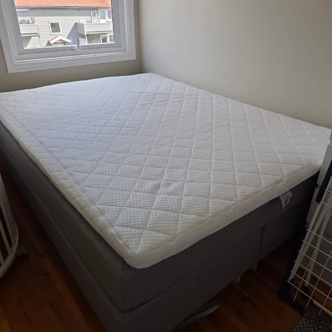Overmadrassen er veldig god og tilpasser seg forskjellig vekt (geltex). Vil egentlig ikke selge, men trenger 2 enkeltsenger isteden.