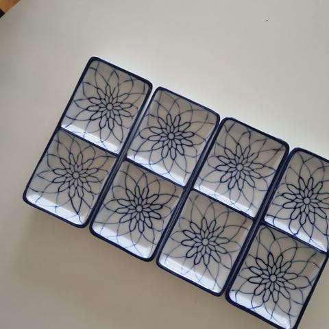 Serveringsfat-sett med 3 hvite skåler i porselen på serveringsbrett