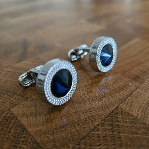 Ukjent merke mansjettknapper i sølvfarget metall med blå rund stein, unisex.