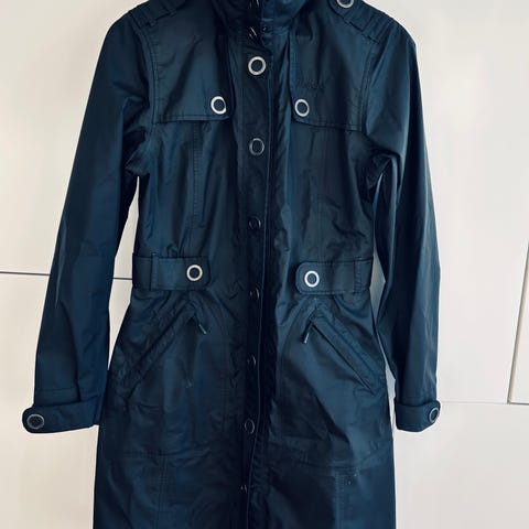Pent brukt, uvattert jakke fra Lindex. Utsvingt modell som gjør at den sitter fint på. Knapper i sidene av midjen for regulering av vidde, samt knapper ved ermekantene.