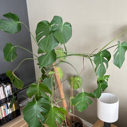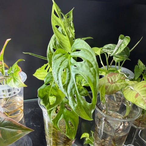 5stk Monstera avleggere med 9-10 blad. Avleggerene er samplantet i potten som vist på bildet. Flere kan bli selvstendige planter. Må hentes.