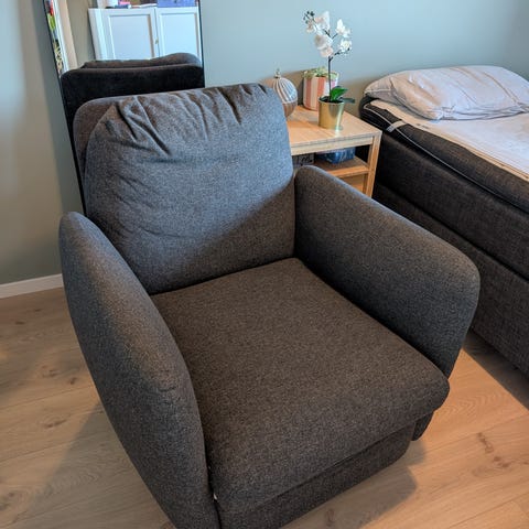 Lysegrå lenestol fra Jakobsen Home (jakobsenhome.com) selges. Kostet 4500 ny. Er 5 år gammel. Vil bli vasket og støvsugd før salg. Kan trenge en lett damprengjøring på armlenedene. Ellers god som ny. Kan eventuelt levere i Fanaområdet.