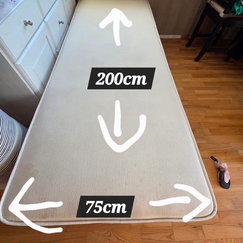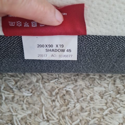Overmadrass ; 4 cm tykkelse , bredde 75 cm , lengde 195 cm