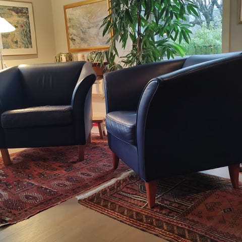 Design lenestoler, svært lite brukt. Ull i sete og skinn i rygg. HBO kr 10 000/ stk