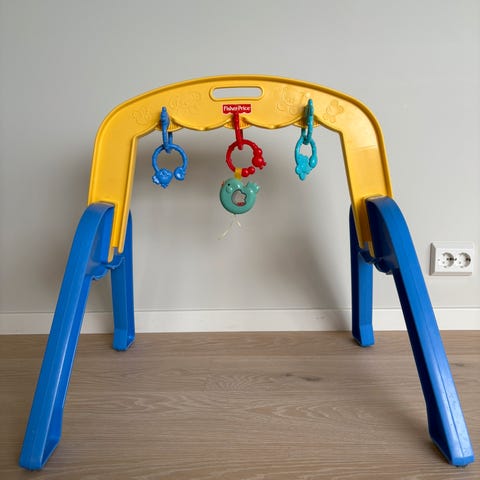 Babygym/leketeppe med leker og musikk fra piano i fotenden.