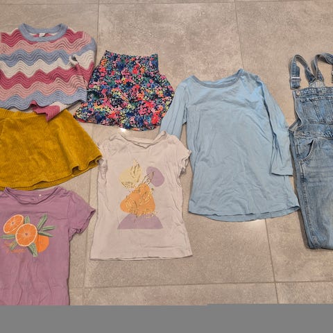 Selger en pakke med sommerklær i str 152. Inneholder shorts, piratbukse, to t-skjorter og en kjole. Kjolen har et par hull, men det er absolutt mye bruk igjen. Resten ser helt og fint ut. Selges samlet.