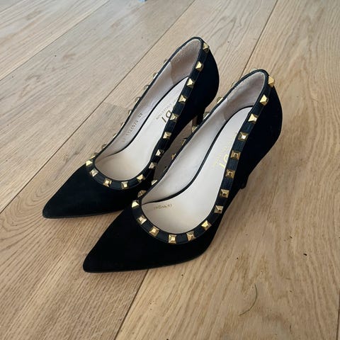 Svarte, høyhælte sko med stilett i gullfarge. Str. 7 1/2B (38, men små i str.). Kun brukt to ganger.