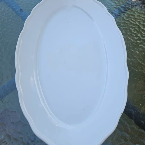 Selger en tallerken/serveringsfat (30 cm diameter) fra Porsgrund porselen. Den ble laget for Kaupang-prosjektet i 1998.