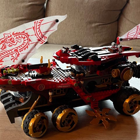 Enorm bil fra Lego ninjago. 70654 Dieselnaut. Minner om Mad Max i Lego (også når du ser på figurene ). Krazy detaljer og anretninger som du ser på nærbilder. En slags kombo av beltebil og bil med svære tykke hjul. Her er det både skytekanon som skyter piler, en felle med myk gummi for å fange ninjaer, tenner og klor i alle retninger, roterende skytetopp med mer. Ble bygget opp og stått på hylla. Foreløpig full av støv, men alt blir demontert og vasket kort tid etter annonseringen . Alle delene er med og alle figurene er riktig satt sammen. Statuen er også med, samt alt av «våpenet». Skurkene: Iron Baron, Skullbreaker, Muzzle og Heavy Metal. Ninjaene Jay og Zane med metall ansikt, samt ung Sensei Wu.