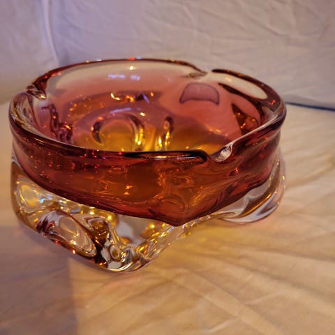 Meget pen stor krystall skål i rosa/gul/klar ca 13 cm høy og 19 cm på det bredeste
