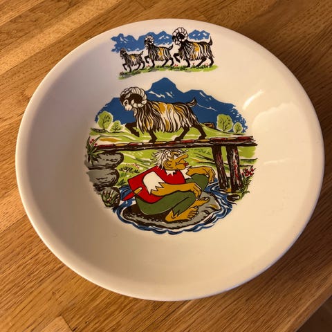Nydelig barnetallerken fra Figgjo i porselen. Med teksten " Å, du som metter liten fugl, velsign vår mat, å Gud ". Diameter 20 cm. Bred gul kant og hyggelig dyremotiv m blomster. Denne er nesten som ny, sterke fine farger, blank glasur.
