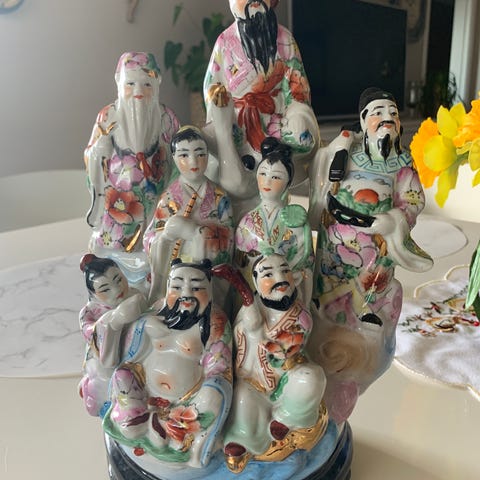 Chinese Ceramic Statue Immortal General Kwan Holding Reishi Fungus Moriage with Removeable Headpiece Ornaments