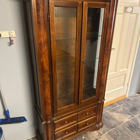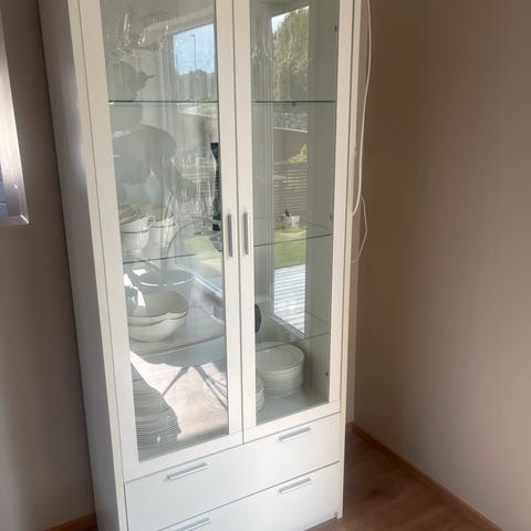 Vitrineskap med glassdører øverst og hvite dører nederst. Det er et dobbelt og et enkelt skap. Det er også en seksjon som går på toppen av dette skapet med glassdører (ikke på bildet) så totalhøyden blir 235cm. Det er installert lys i toppen av alle seksjonene med glassdør, også i toppseksjonen. Pent brukt, noen små bruksmerker som ikke er særlig synlige.