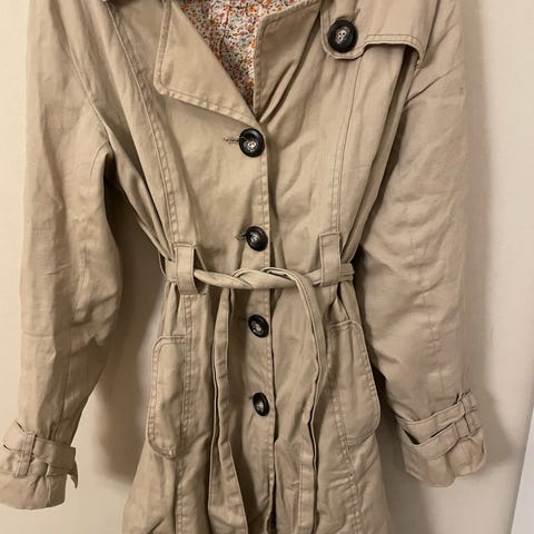 Hvit/beige kåpe som fungerer fint over kjoler eller som en vårjakke ved oppholdsvær. Kåpa er kun brukt én gang i en konfirmasjon. Jakken lukkes med pressknapper.