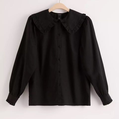 En søt hvit bluse med lange ermer, bred skjortekrage, rysjedetaljer og rett passform, laget av myk bomull.