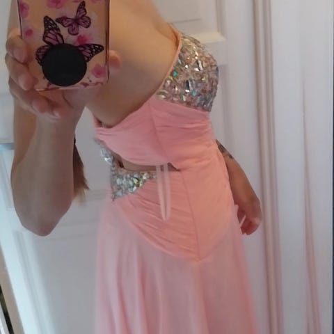 Ballkjole, ca str 38/M. Snøring i ryggen til å stramme. Sateng over, tyllskjørt under. Brukt ved en anledning.