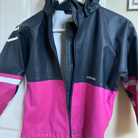 Overgangsjakke fra Didriksons i str 110. Pent brukt, men har to små «svimerker». Kan nok lappes. Selges derfor billig. For øvrig minimal slitasje.
