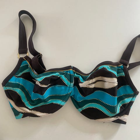 Ny! Bikini overdel fra Change str.85D blå med flere blå fager og hvit mønstrete. Lås bak på ryggen og skuldrestropper. Se bilder. Kr.75. Kan hentes på Kolbotn ettermiddag, kveld, helg og enkelte dager på dagtid og I Oslo sentrum Lakkegata 23 på hverdager mellom kl.08.00-15.00. Sendes med fiks ferdig.