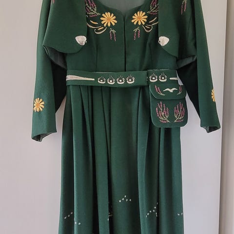 Karen drakt selges. Medium, passer til 170 og oppover. Mye stoff å sy ut på. Sølv følger med. Kjolen, jakke og skjorte er renset. Ingen skader.
