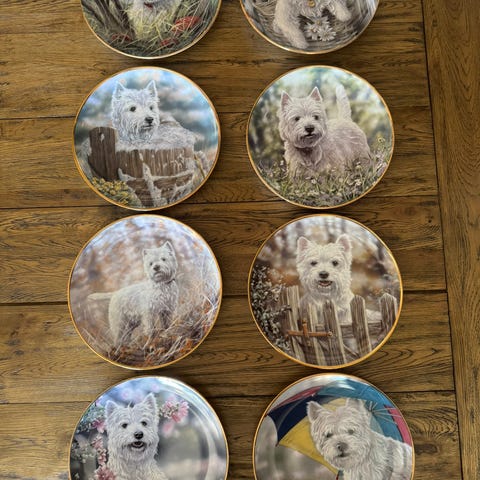 4 stk Westie samle tallerkener designet av Jamie Leighton, selges samlet for 400kr. Tallerknene fremstår som nye, uten synlig slitasje. Er kun til pynt, og ikke til å spise av. Kan sendes mot betaling av porto, pakker godt. Bruker ikke fiks ferdig.