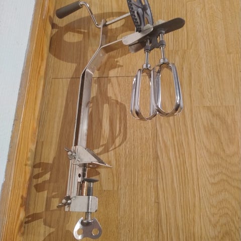 Hjulvisp slik at man kan piske både krem og eggedosis uten strøm. På boksen er det måleskala.