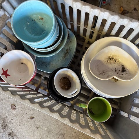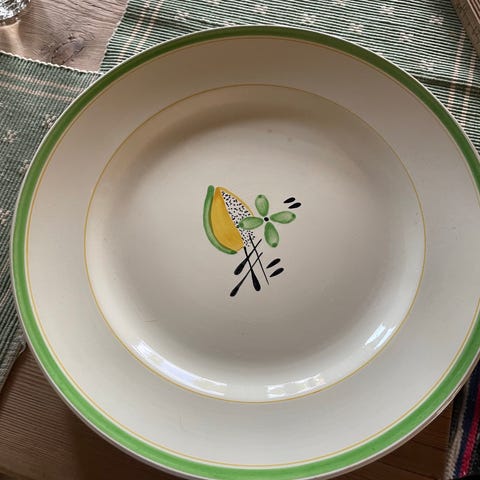 Pent brukte store tallerkner, kan brukes som fat. Serveringsfat